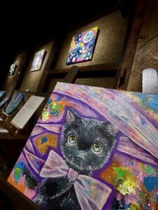 ▲可愛らしいタッチで描かれた吉乃さんのアクリル画作品。優しく多彩な色使いで描かれた動物作品は見る人の心に癒しと栄養を届けます。要所コラージュが素敵なアクセントです。