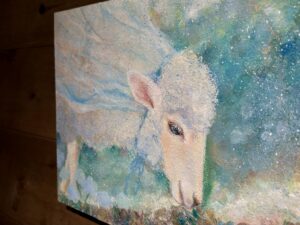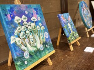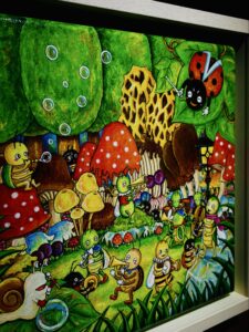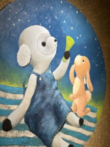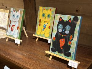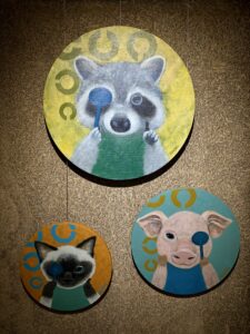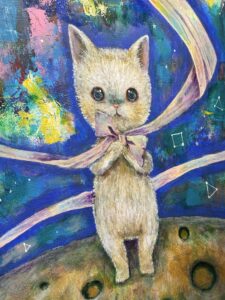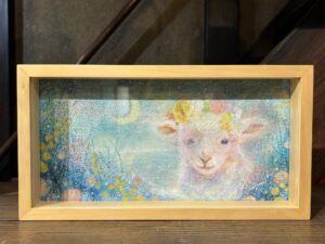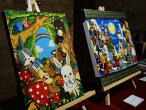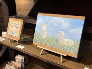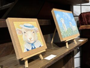 ▲日常にある小さな優しさを動物達に乗せて描いたアクリル画作品。優しい色使いで描きかれたどことなく人間っぽい動物達の表情や仕草が大切な事を思い出させてくれます。