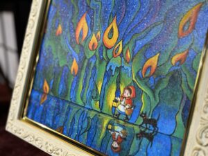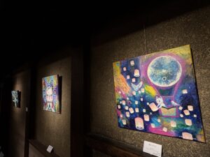 ▲透明感のある豊かな色彩で描かれた木津さんの絵画作品。物語の情景や楽しいシーンがダイレクトに伝わってきます。木津さんは日本各地の民話をテーマに作品を制作されています。