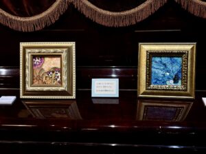 ▲オイルパステルでコルクに描いた絵画作品。