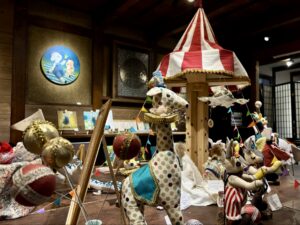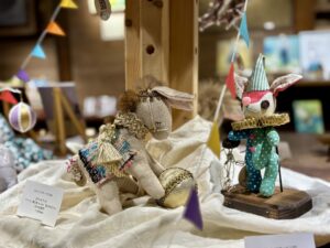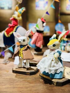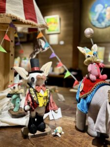 ▲ナカノさんが創り上げた世界「縫々王国」の登場人物たち。そこに暮らすボタンウサギと仲間達は多くの人の心を楽しませます。今回はカメノコサーカス団が茶吉庵に遠征。