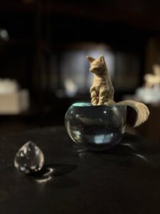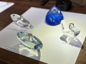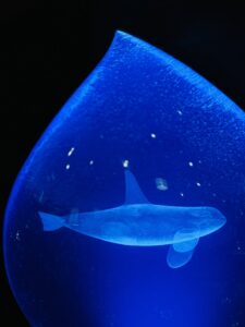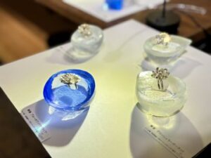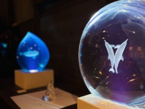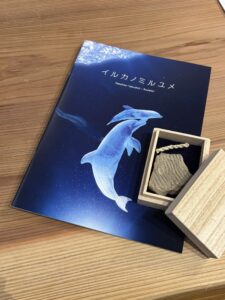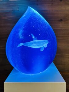 ▲薬師寺さんの原点といえる海とイルカの作品。精密に彫刻したイルカ像をアクリルに封じ込めた透明な作品は、海をそのまま地上へ切り出して来たかのような美しさと臨場感を放っています。