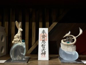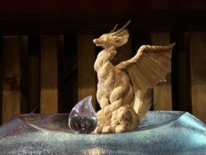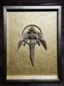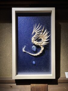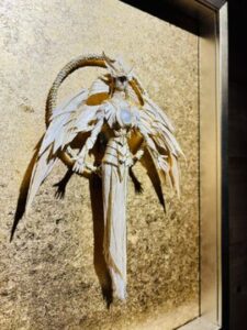 ▲薬師寺さんのご友人の漫画家 高橋和希さん原作『遊☆戯☆王』に登場するアストラルとホルアクティ。水の宝珠を抱く高橋さんの描きおろしのアストラル像とその宝珠宿るドラゴンとホルアクティを精麻で形どった薬師寺さんの彫刻作品。とてつもない神々しさを放っています。