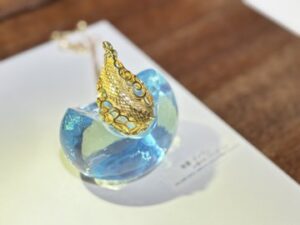 ▲ネイティブアメリカンのご友人との交流から生まれたジュエリー作品。天然石やシルバーを素材にスタイリッシュにデザインされた龍や蓮は、鱗や葉脈など細部まで緻密に作られ、薬師寺さんの作品のエッセンスが凝縮されています。