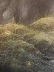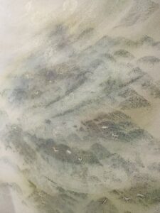 ▲淡い緑色で描かれた山並みはとても静謐で、上品な胡粉の白や金泥雲母の煌きをともなってとても神聖な雰囲気を醸し出しています。