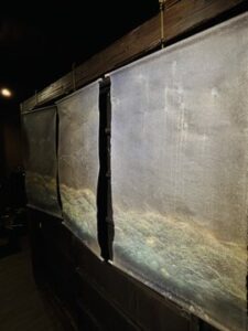 ▲薬師寺さんの新たな素材「精麻(せいま)」を使った作品。丁寧に解きほぐされて螺旋をともない綯われた精麻作品はとても清浄で、風の息吹を感じることができます。