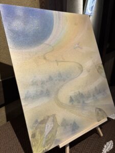 安田さんのテーマカラー青と緑を紡ぐように、様々な色が優しく折り重なり、この世と異世界の境界を神秘的に描き出しています。