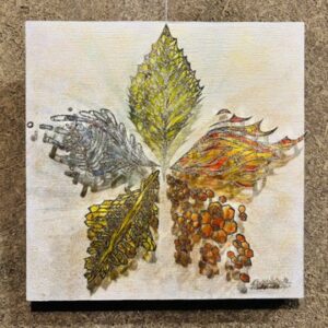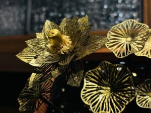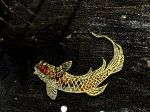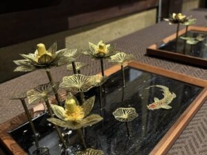 ▲蓮や鯉の切り絵、レジン、木盆の木目をツールとして、水というエレメントのもつ表情を表現した作品。