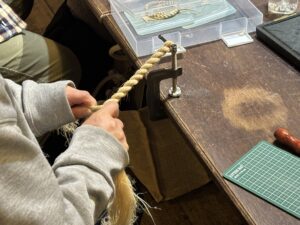 ▲会期中、個展会場では精麻作品を制作するワークショップが行われました。WSでは精麻を使ったブレスレットやしめ飾りを制作。