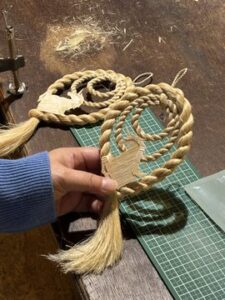 龍のしめ縄を共に創る藤山氏は、しめ縄の師であり、私の創造性を深く理解してくれる戦友です。彼の熟練の技と自由な発想は、常に私に新たな刺激を与えてくれる大切な存在です。