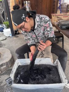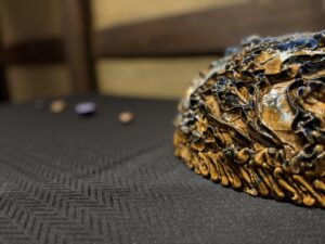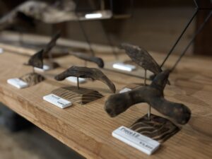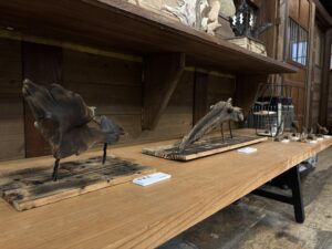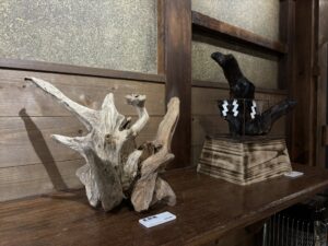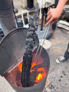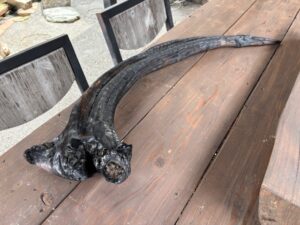 ▲生き物の牙の様な焼流木は一本の長い流木を焼き上げ、炭化した部分をやすりと水で長時間丁寧に磨き上げることで、残された芯の部分が光沢のある黒い象牙の様に仕上がります。