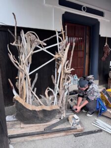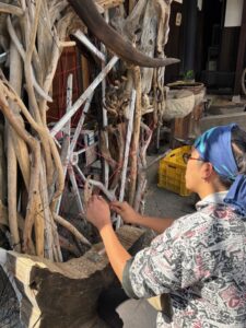 「今回の作品テーマは循環です。これまでライブクリエイションに参加されたアーティストの皆さんの作品要素を流木で組み上げ、新しい作品[命]にしていきます。」(Genky)