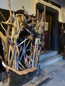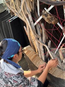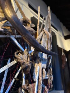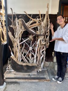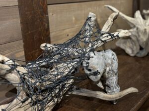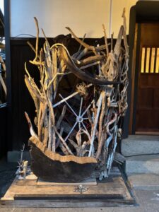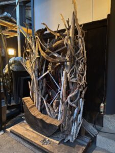「僕の作品の大きなテーマの一つ“繋がり”です。メイン素材の流木を紐や糸で繋いで一つの作品を生み出しています。」(Genky)