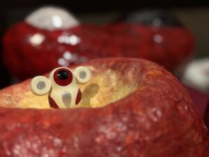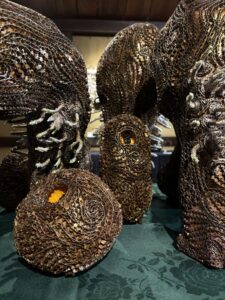 ▲萩本さんが生み出した「タク・ア・ラ・ジーマ」という架空の島にいる生き物たちを造った造形作品。段ボールの持つタフさと芯材のウネウネ感、金属質の質感がちょっと不気味でかわいくユニークな作品です。