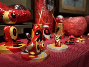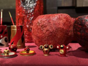 ▲「赤」「白」「黒」をメインカラーに平面立体問わず制作される鈴木マヤ子さん。チェプラーシカ、小さなりんご、小さな猫や鹿はプリミティブなイメージに加え、愛らしさも感じさせます。