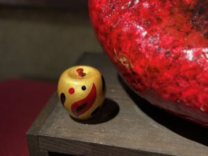 ▲夛保さんの仮面作品。極彩色の彩色と石粉粘土による精度の高い、人智を超えた哲学的造形は多くの人の目を釘付けにします。