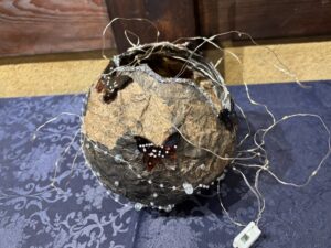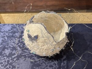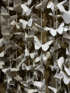 ▲和紙でできた大口さんの立体作品。過去が変容し、未来がたくさんの蝶の形として解き放たれていく物語をそれぞれの作品で表現されています。