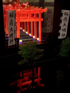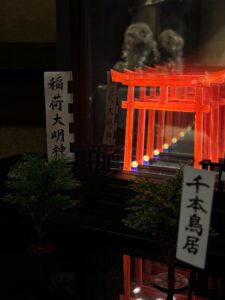 ▲合わせ鏡の鏡面効果を使った柏原さんの立体作品。鏡に映し出された暗闇の中で光る千本鳥居はまるでと異界へと繋がる入り口の様です。