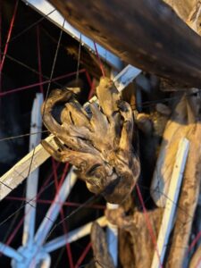 ▲作品の中央左の位置で赤と黒の糸に支えられて空中に浮遊する瘤流木は血管と心臓のようです。
